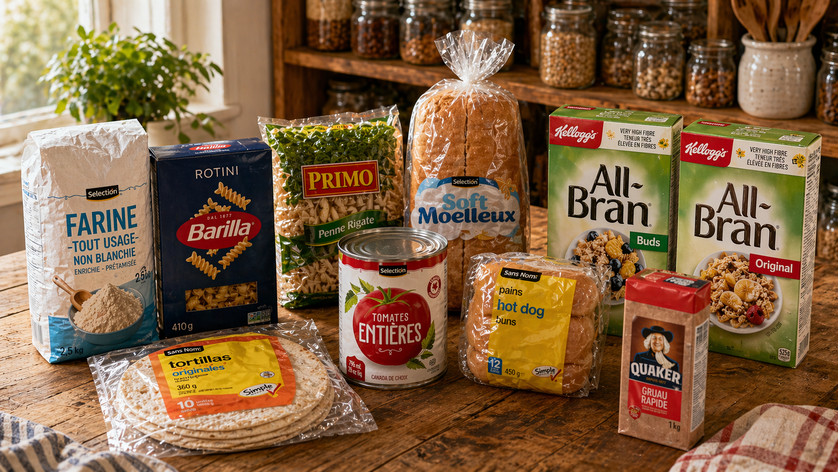 Les produits secs, c’est une des catégories les plus importantes dans une logique de prix plancher, parce que c’est souvent là que se bâtit la vraie base du garde-manger. Martin aime particulièrement cette section-là, parce qu’elle montre bien la différence entre acheter pour remplir un panier… et acheter pour créer une vraie stabilité. Farine, pâtes, riz, avoine, tomates en boîte, pains, tortillas, céréales : ce sont des produits qui reviennent sans arrêt dans la vraie vie, puis qui permettent de cuisiner, dépanner, étirer et structurer une semaine sans tomber dans le cher.