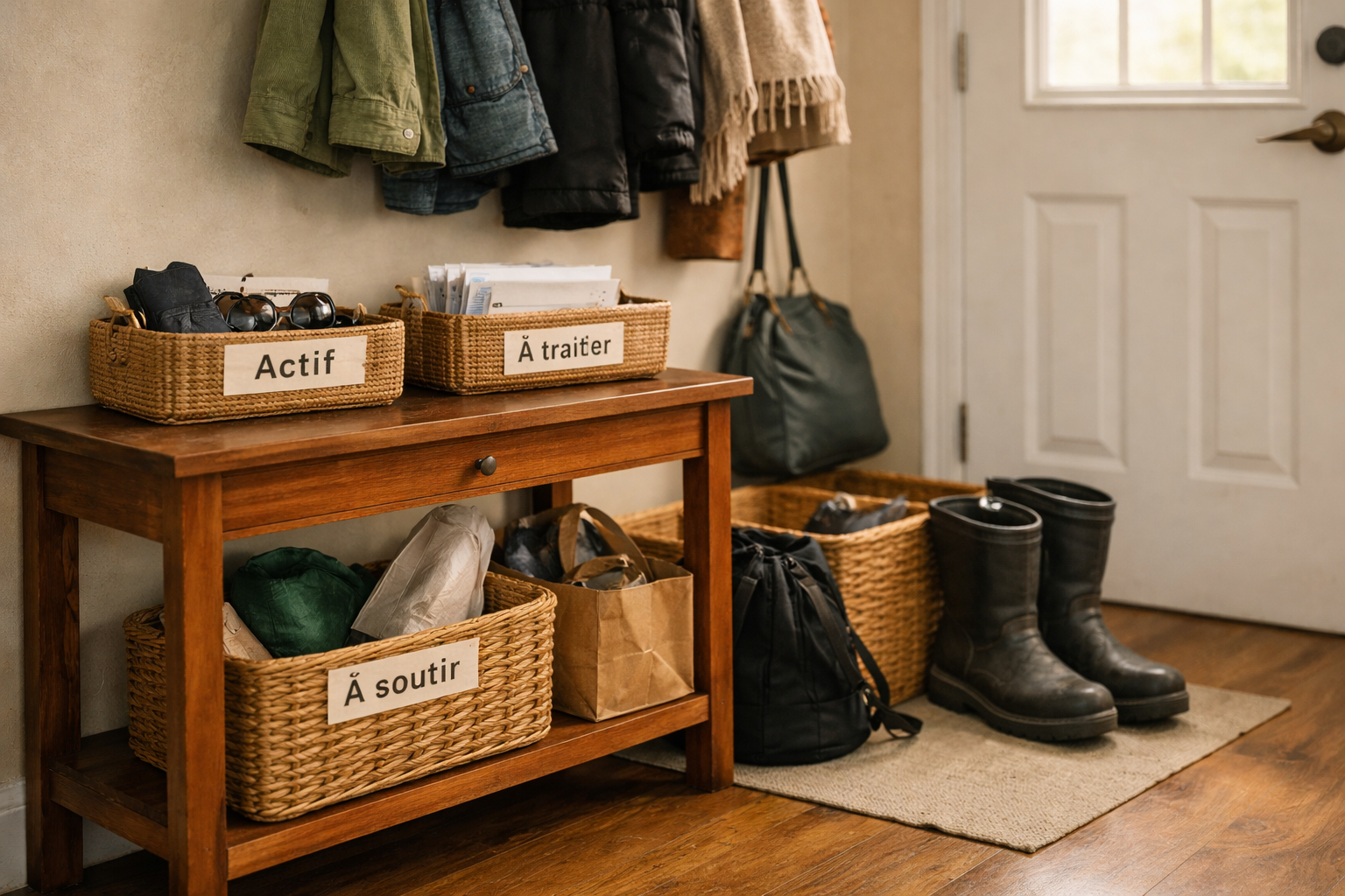 Pas besoin d’acheter des bacs haut de gamme pour ça. Trois boîtes récupérées, trois paniers dépareillés ou trois contenants solides font parfaitement l’affaire. Ce qui compte, c’est que le système soit évident. Quand tu rentres, tu déposes. Quand tu sors, tu vois tout de suite ce qu’il faut prendre. L’entrée cesse d’être une zone de stress, puis redevient un point de passage qui t’aide au lieu de t’alourdir.