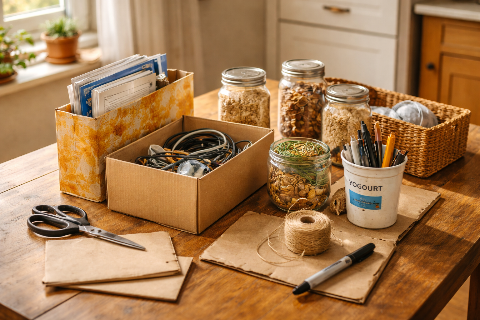 Avant d’acheter quoi que ce soit, fais le tour de ta maison. Regarde vraiment. Tu vas souvent trouver des boîtes de chaussures, des pots Mason, des contenants de yogourt, des boîtes de céréales, des paniers oubliés, des petits bacs ou du carton rigide. Tout ça peut redevenir utile avec un peu de logique. Une boîte de céréales coupée peut servir de séparateur de tiroir. Un pot en verre peut contenir des crayons, des pinces, des sachets ouverts, des vis ou des élastiques. Une boîte de chaussures peut regrouper les câbles, la papeterie, les produits de salle de bain ou le petit stock qui se promène toujours sans but clair.