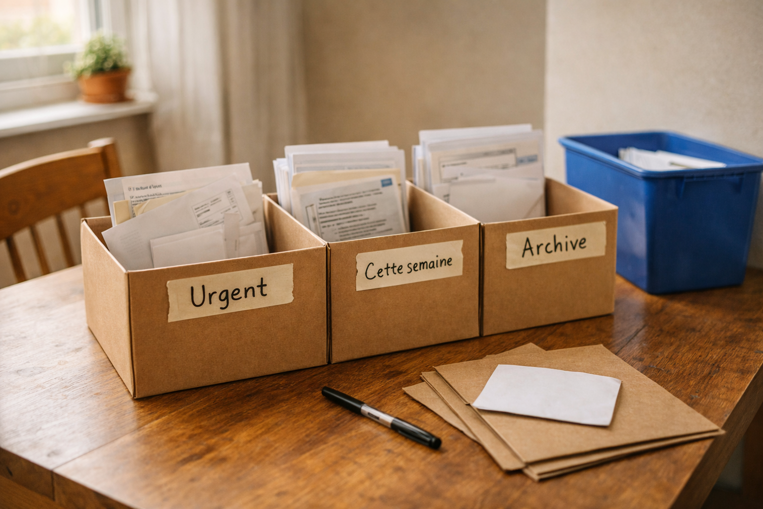 La meilleure solution, c’est de simplifier radicalement. Trois catégories, pas plus. Urgent pour ce qui doit être réglé rapidement. Cette semaine pour ce qui demande une action bientôt. Archive pour ce qui doit être gardé. Pas besoin de classeur sophistiqué ni de matériel de bureau impressionnant. Une boîte de chaussures séparée avec du carton, trois vieilles chemises, quelques enveloppes épaisses ou des pochettes récupérées suffisent largement.