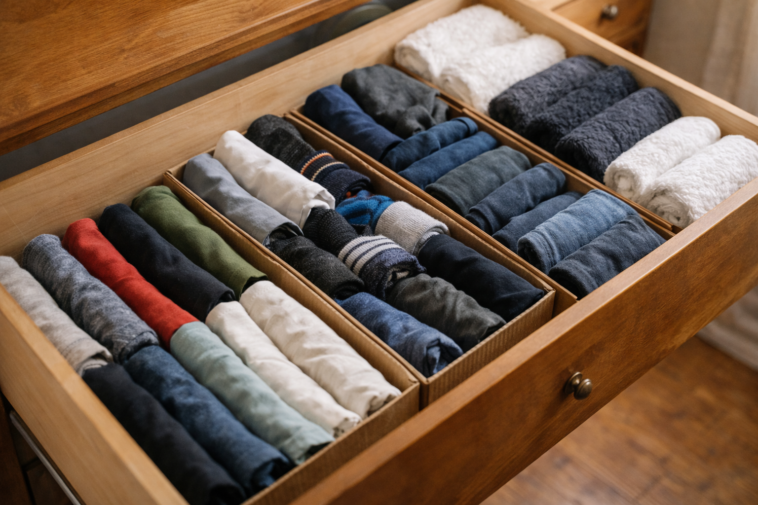 Le rangement vertical change cette dynamique presque immédiatement. L’idée est simple : au lieu d’empiler en hauteur, tu plies chaque catégorie de façon semblable, puis tu ranges les morceaux debout, comme des dossiers. T-shirts ensemble. Bas ensemble. Serviettes ensemble. Pantalons ensemble. Tout devient visible d’un coup d’œil.