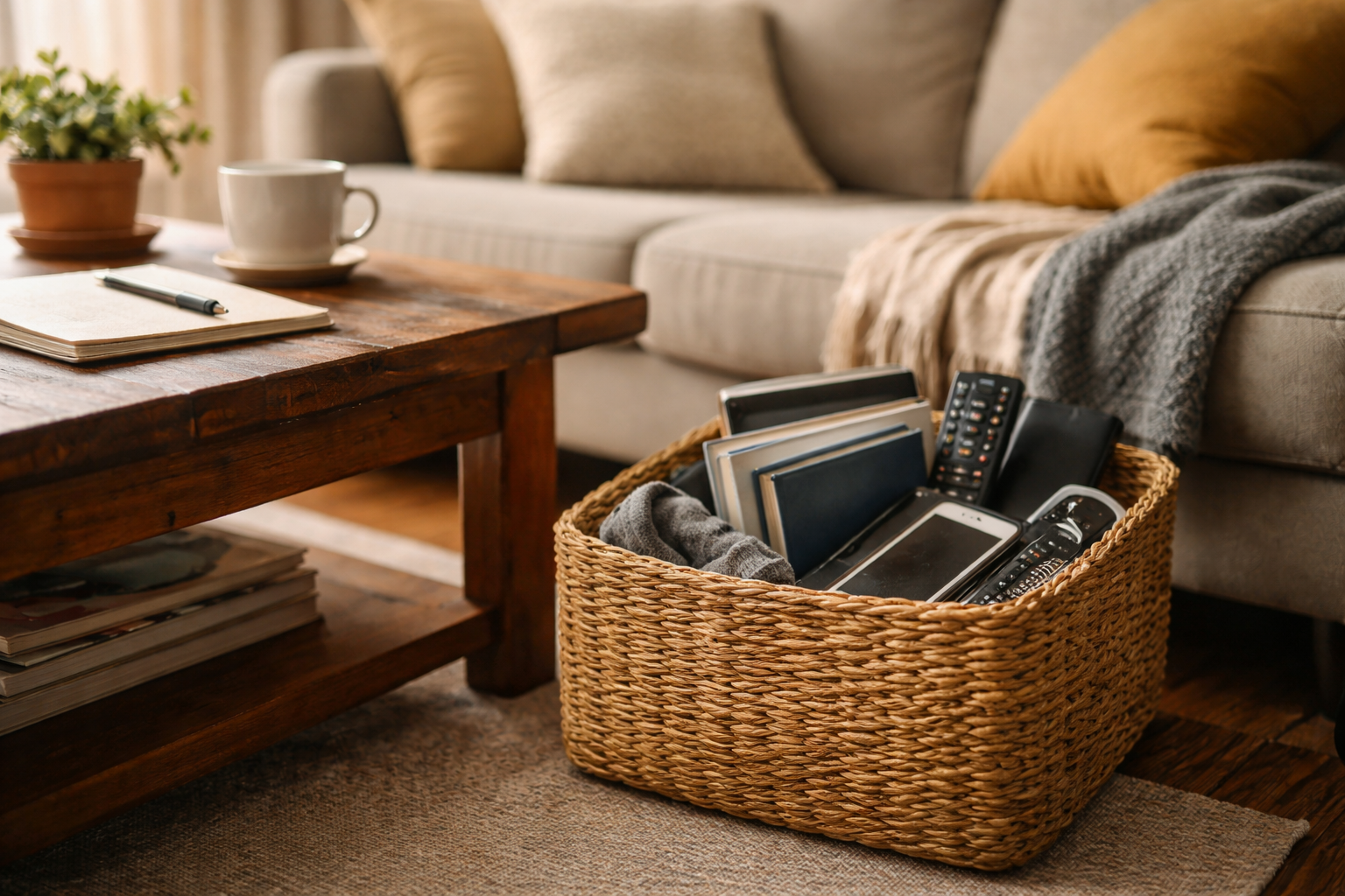 Résultat : même quand la maison n’est pas sale, le salon a l’air encombré. Et ce désordre visuel-là te vole exactement ce que cette pièce devrait offrir : un peu de repos. C’est là que le panier ramasse-tout devient une astuce ridiculement simple, mais très puissante.