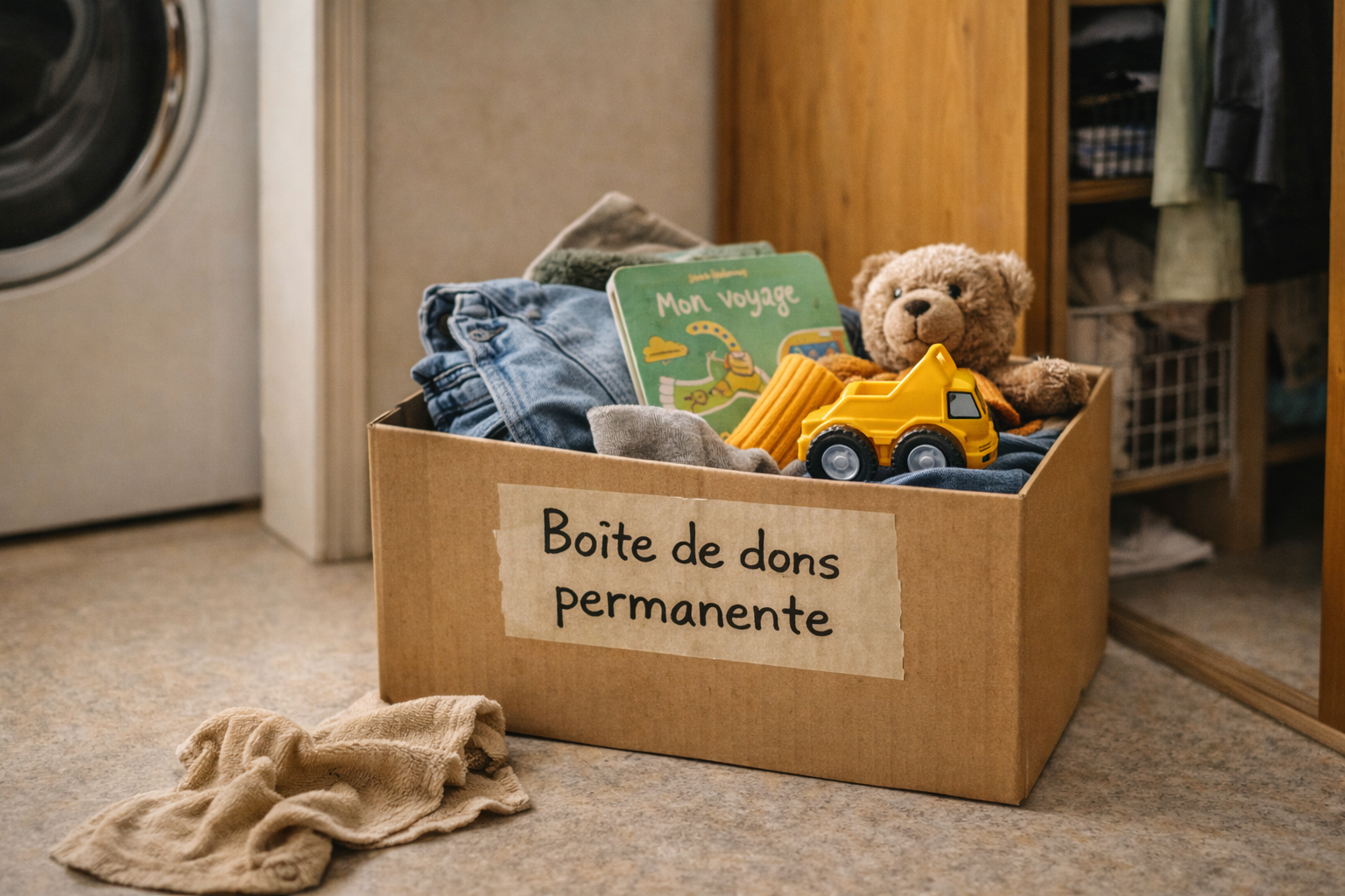 Ce système fonctionne parce qu’il enlève le drame. Tu ne fais pas “le grand tri”. Tu prends juste l’habitude de laisser partir ce qui n’aide plus ta vie. Et quand la boîte est pleine, tu la sors. Friperie, organisme local, don à quelqu’un. La maison s’allège progressivement, sans grande cérémonie ni épuisement moral.