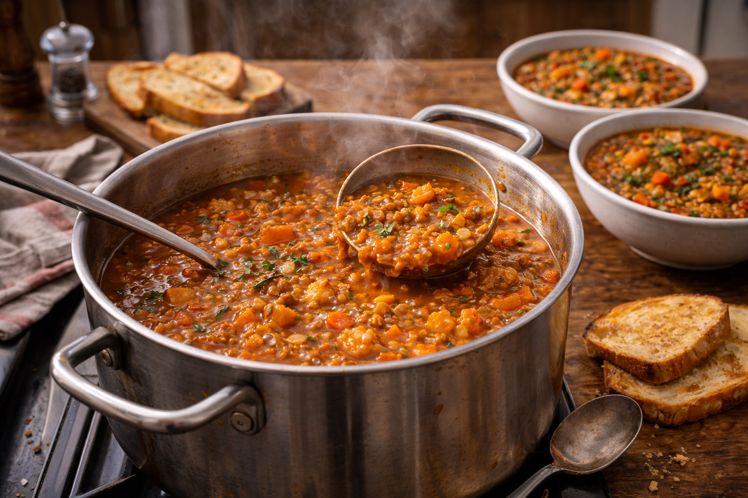 Les lentilles sont probablement l’un des plus grands miracles budgétaires encore accessibles aux gens normaux. Elles rassasient, elles se conservent bien, elles s’achètent à faible coût, puis elles s’intègrent à merveille dans une soupe complète. Le riz vient donner du corps. Les tomates ajoutent la profondeur. Les carottes, l’oignon et le bouillon font le reste. Rien ici n’a besoin de flasher. Tout travaille. Tout a un rôle. Puis à la fin, tu obtiens un repas complet qui peut nourrir quatre personnes sans te faire sentir que tu as “coupé”.