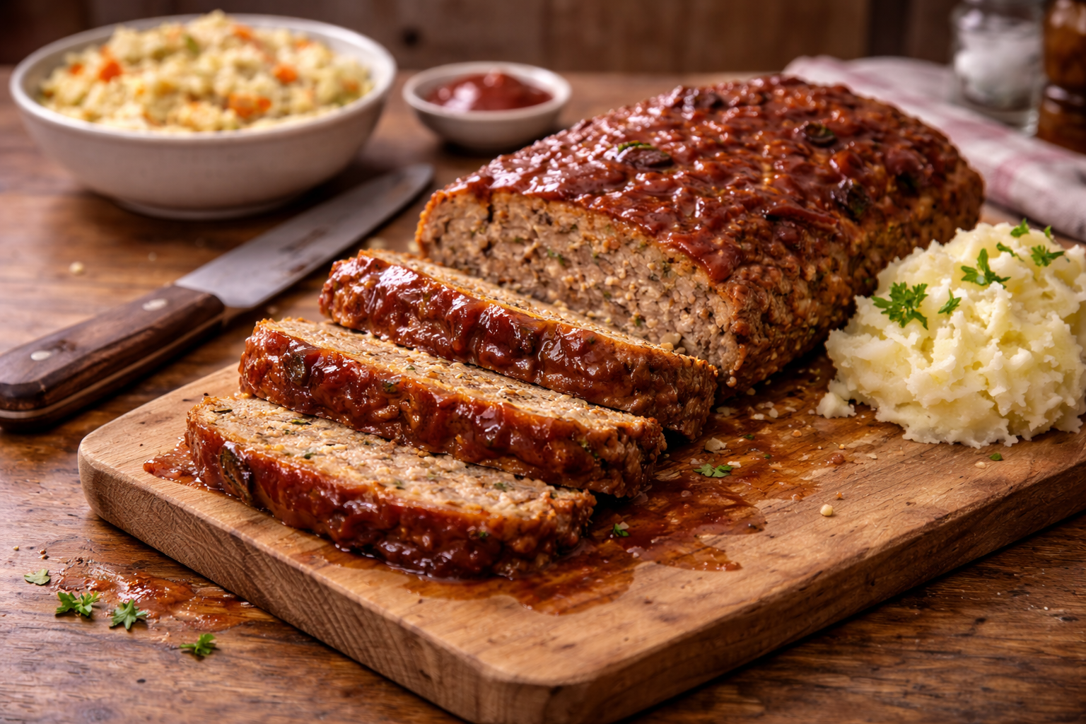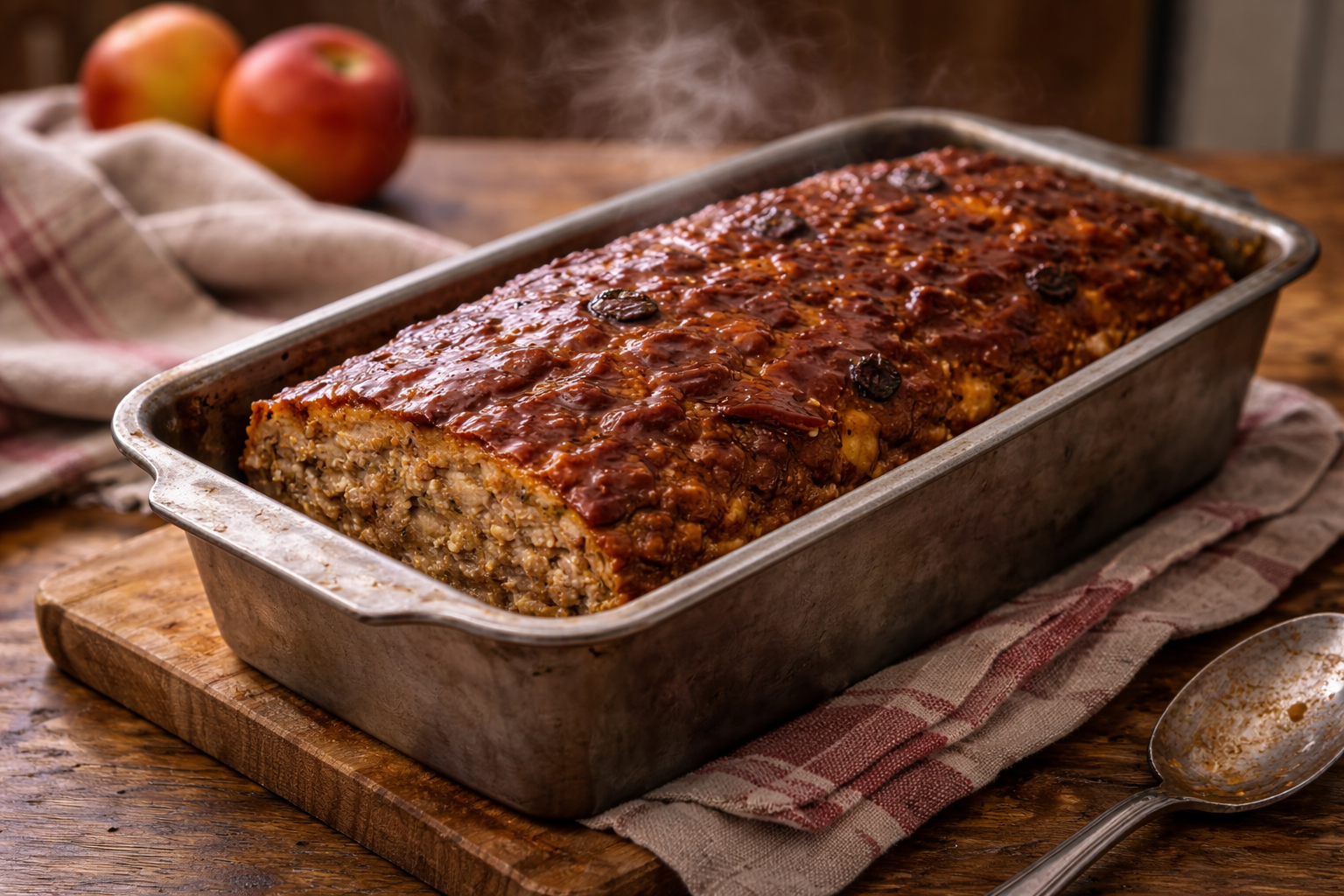 Choisis du porc haché en format familial quand le prix chute, puis divise-le en portions déjà mesurées pour tes futures recettes. Utilise des pommes légèrement molles ou en liquidation: elles sont souvent parfaites pour cuisiner et coûtent moins cher. Pour étirer encore plus le repas, sers le pain de viande avec du riz blanc ou des pommes de terre rôties. Le lendemain, les tranches restantes font aussi d’excellents sandwichs de lunch.