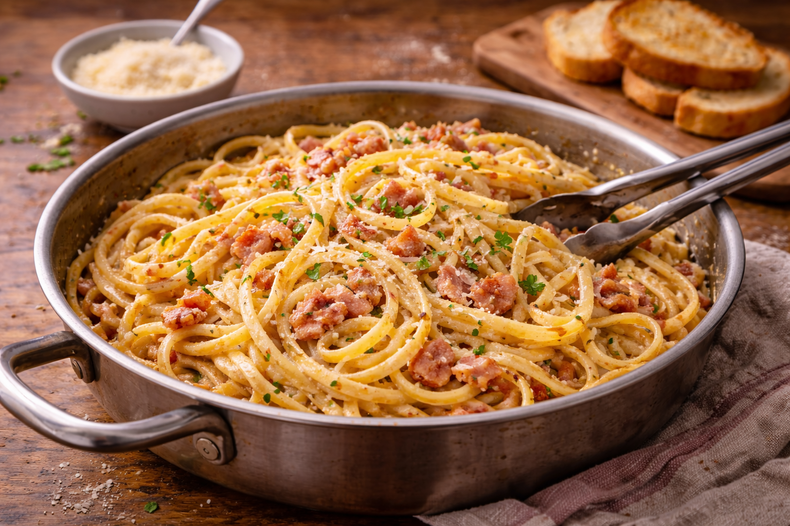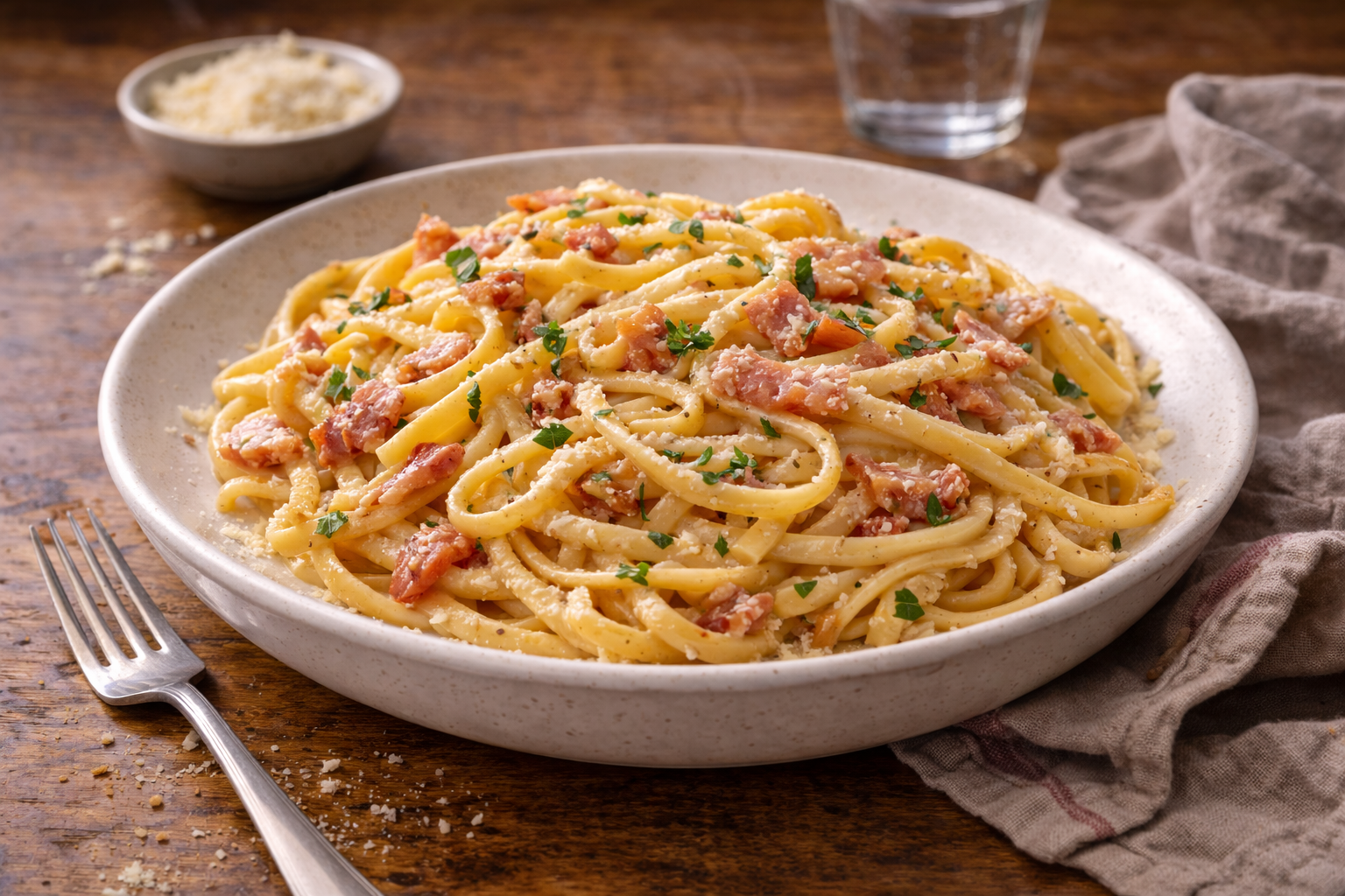 Ici, on simplifie sans ruiner l’expérience. Les œufs font la magie. Le lait aide à étirer. Un peu de parmesan vient donner le punch. L’eau de cuisson fait le reste. Puis soudain, avec quelques bons gestes, tu obtiens une sauce lisse et savoureuse qui enrobe les linguines comme si tu avais payé bien plus cher pour l’assiette. C’est rapide, c’est satisfaisant, puis c’est exactement le genre de repas qui rappelle qu’une bonne technique vaut parfois plus qu’un panier rempli d’ingrédients chers.