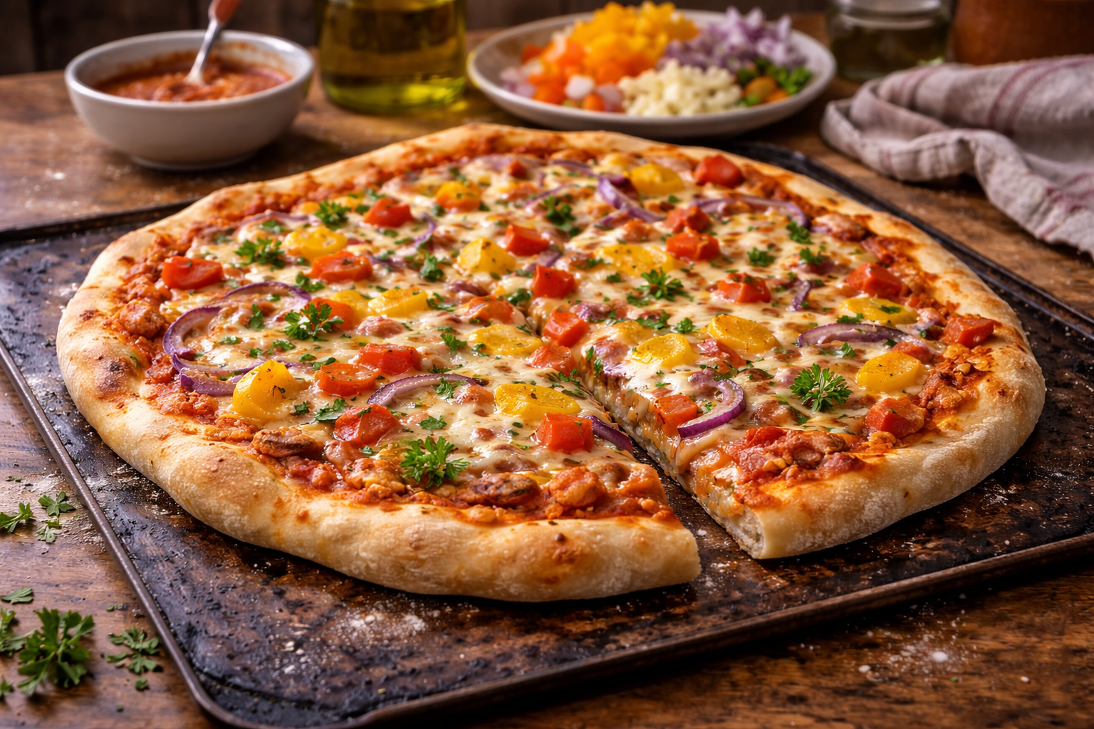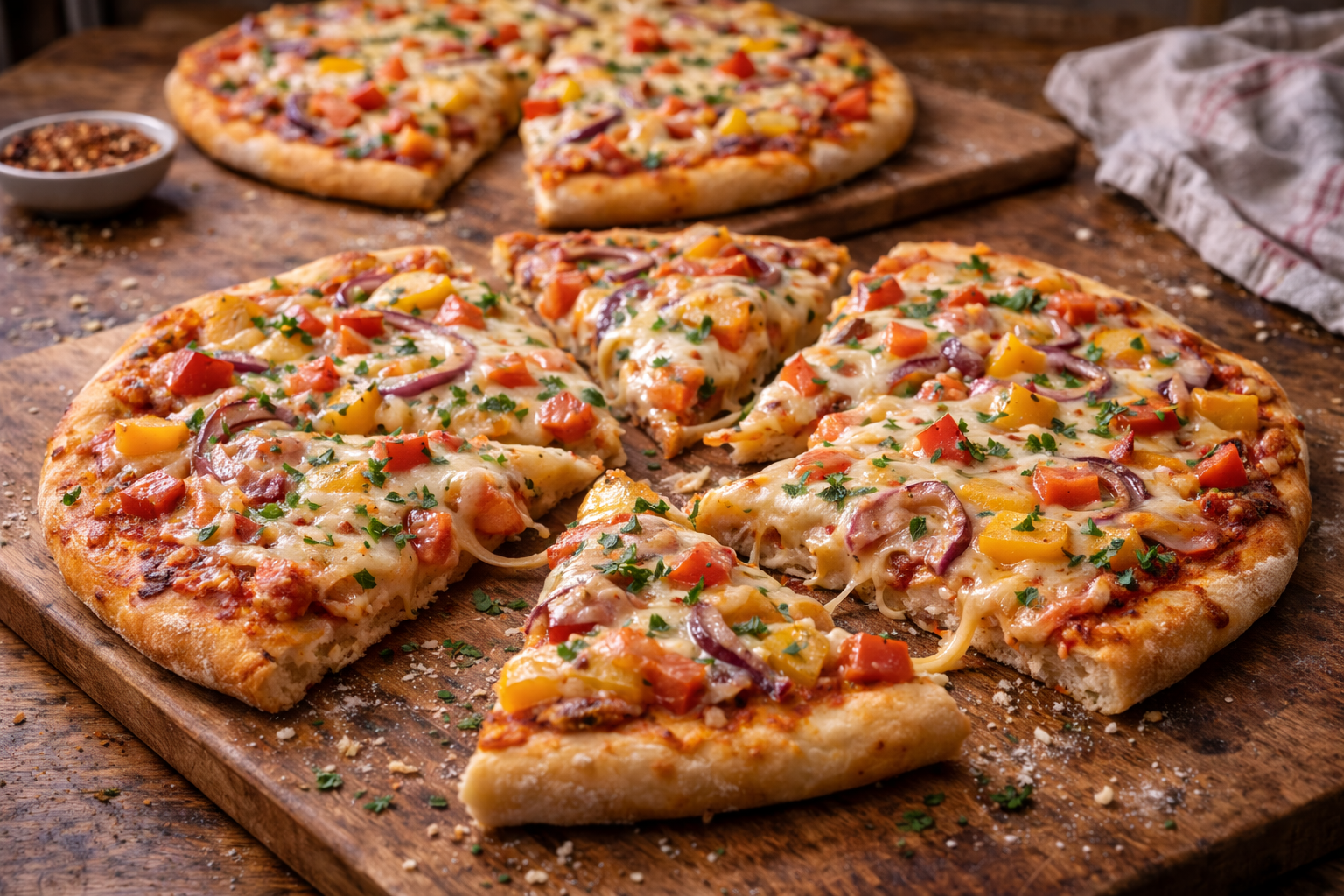 Cette version Frugalo est exactement ça: croustillante, généreuse, satisfaisante, puis étonnamment économique. La farine coûte presque rien. La levure fait sa job. Les légumes qui traînent dans le frigo trouvent enfin une mission honorable. Puis le fromage, bien réparti, fait son effet sans exiger une demi-brique par pointe. On est loin de la pizza triste de dépannage. On est dans quelque chose de chaleureux, de convivial, puis de franchement payant.