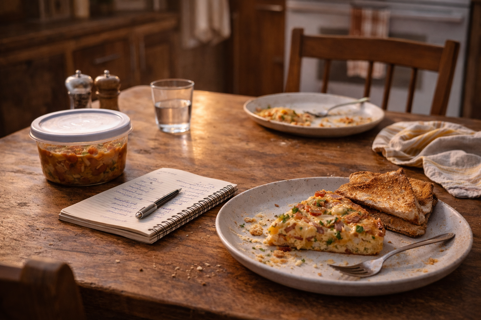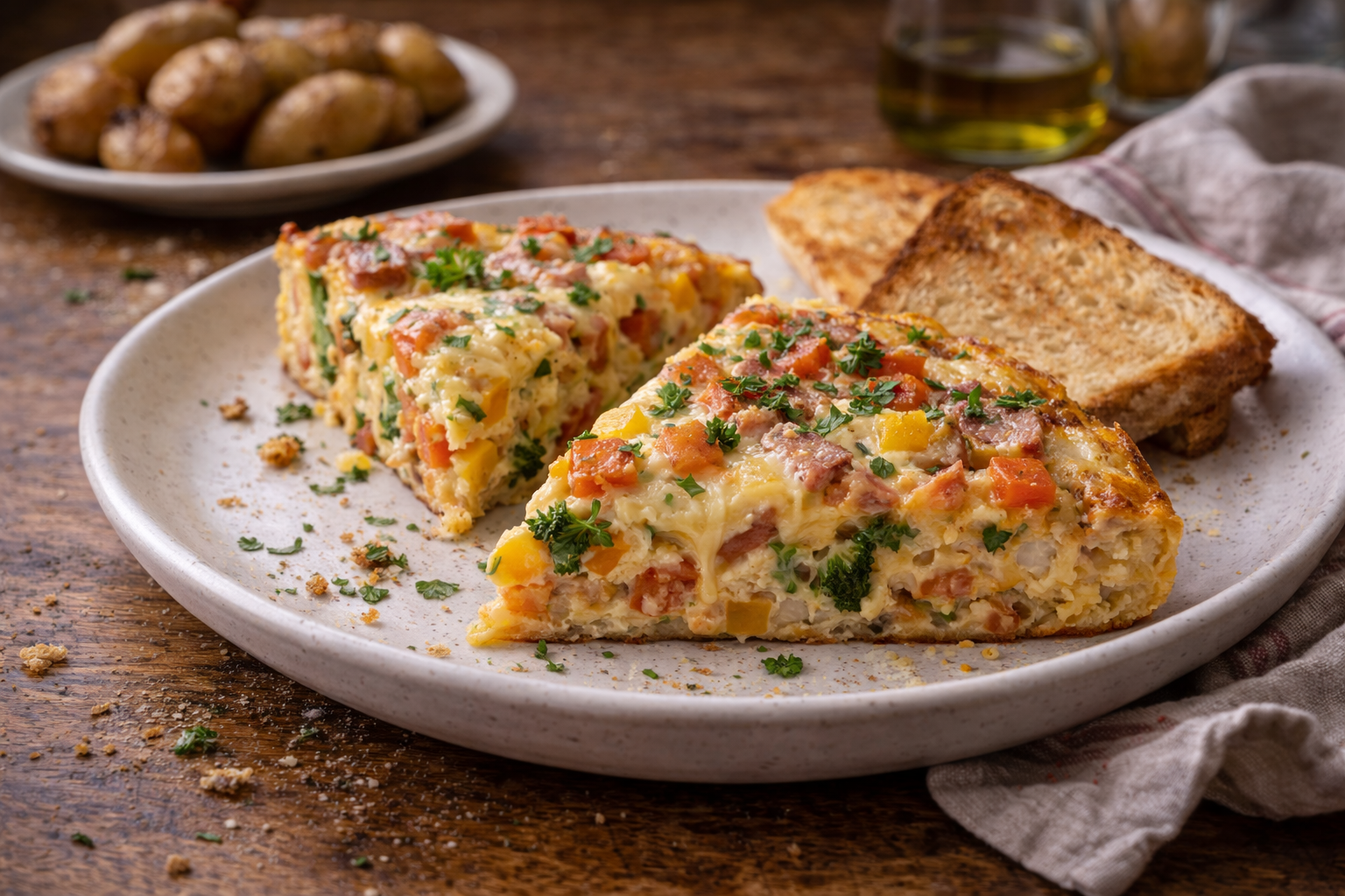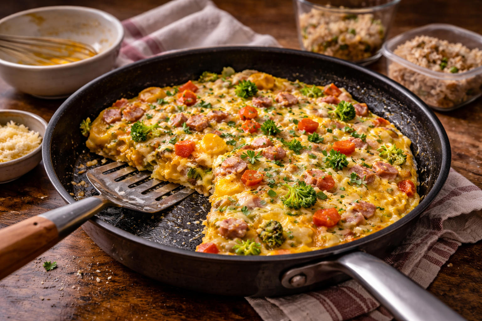 Avant l’épicerie, fais toujours un “tour d’omelette” du frigo. Regroupe les petits restes qui ne suffisent plus seuls, puis pense immédiatement omelette, frittata ou quiche sans croûte. Ajoute une cuillère d’eau aux œufs battus pour une texture plus légère. Le fromage peut être réduit ou remplacé par un petit reste congelé. Servie avec pain grillé, pommes de terre ou crudités simples, cette recette devient un vrai souper complet pour presque rien.