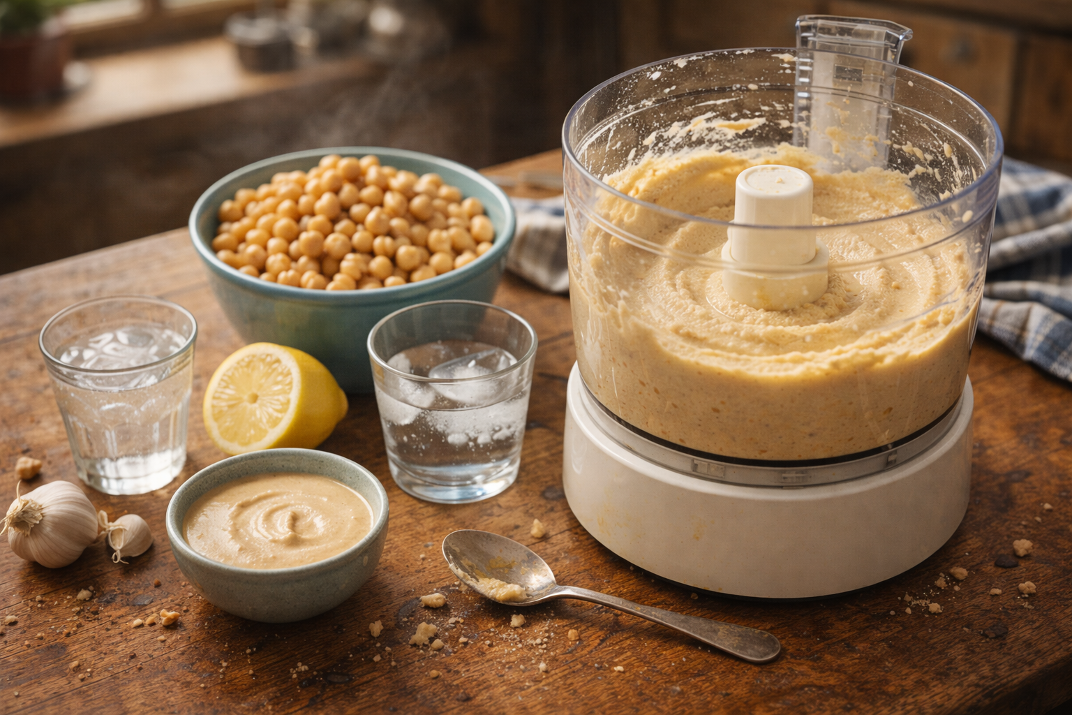 Le secret, c’est la texture. Des pois chiches bien cuits, idéalement encore un peu tièdes, du tahini, du citron frais, puis de l’eau glacée ajoutée progressivement pendant le mixage. C’est ce détail-là qui change la game. Le hummus devient plus léger, plus blanc, plus crémeux, puis carrément plus digne de ton pain pita. Le texte source insistait beaucoup là-dessus, et avec raison : c’est une vraie technique payante.