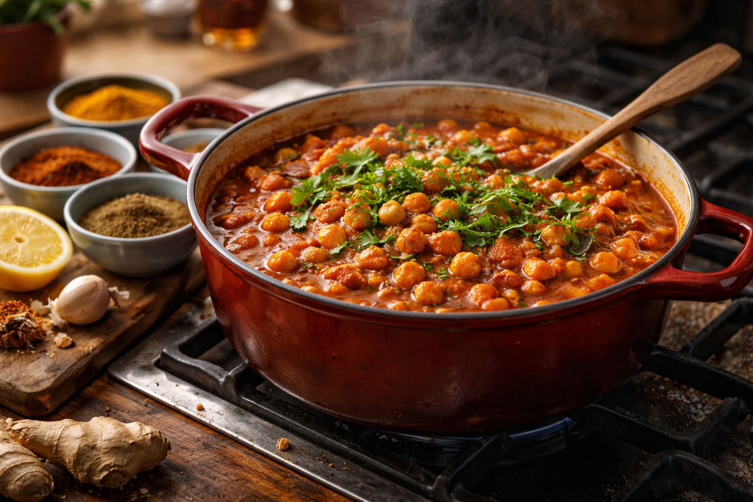 La beauté de cette recette, c’est qu’elle utilise des bases très simples : pois chiches, oignon, ail, gingembre, tomates, épices. Rien de luxueux. Rien de compliqué. Mais si tu respectes les étapes, le résultat goûte beaucoup plus cher que son coût réel. C’est exactement le genre de recette qu’on veut dans une cuisine FRUGALO : un repas capable de nourrir, de remplir, de se réchauffer bien, puis de ne pas nous faire regretter d’avoir cuisiné.