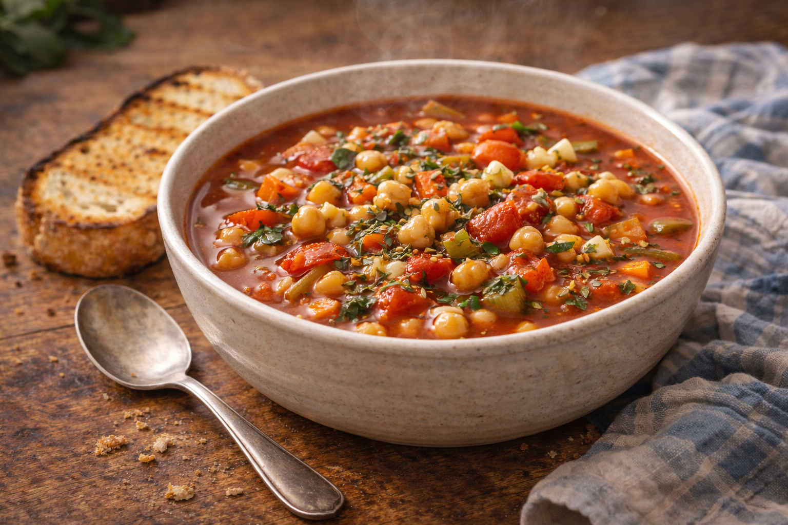 Avec de l’oignon, de l’ail, des carottes, du céleri, des tomates, du bouillon puis des pois chiches, tu obtiens un repas qui sent la maison, le calme puis le gros bon sens. C’est le genre de soupe qui te rappelle qu’on peut encore manger quelque chose de bon, nourrissant et chaleureux sans transformer le budget en champ de ruines.