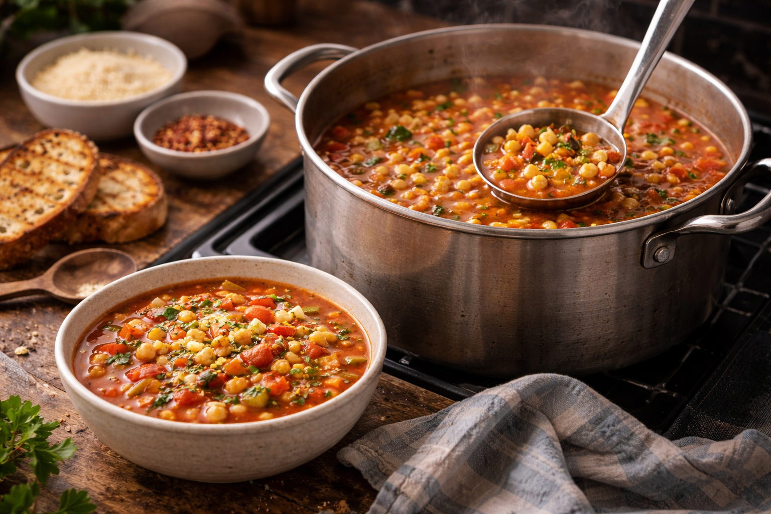 Il y a des recettes qui ne cherchent pas à impressionner. Elles cherchent à réparer un peu la vie. Cette soupe italienne aux pois chiches et tomates entre exactement dans cette catégorie-là. Elle est simple, oui. Mais simple dans le bon sens. Pas vide. Pas triste. Juste profondément rassurante.