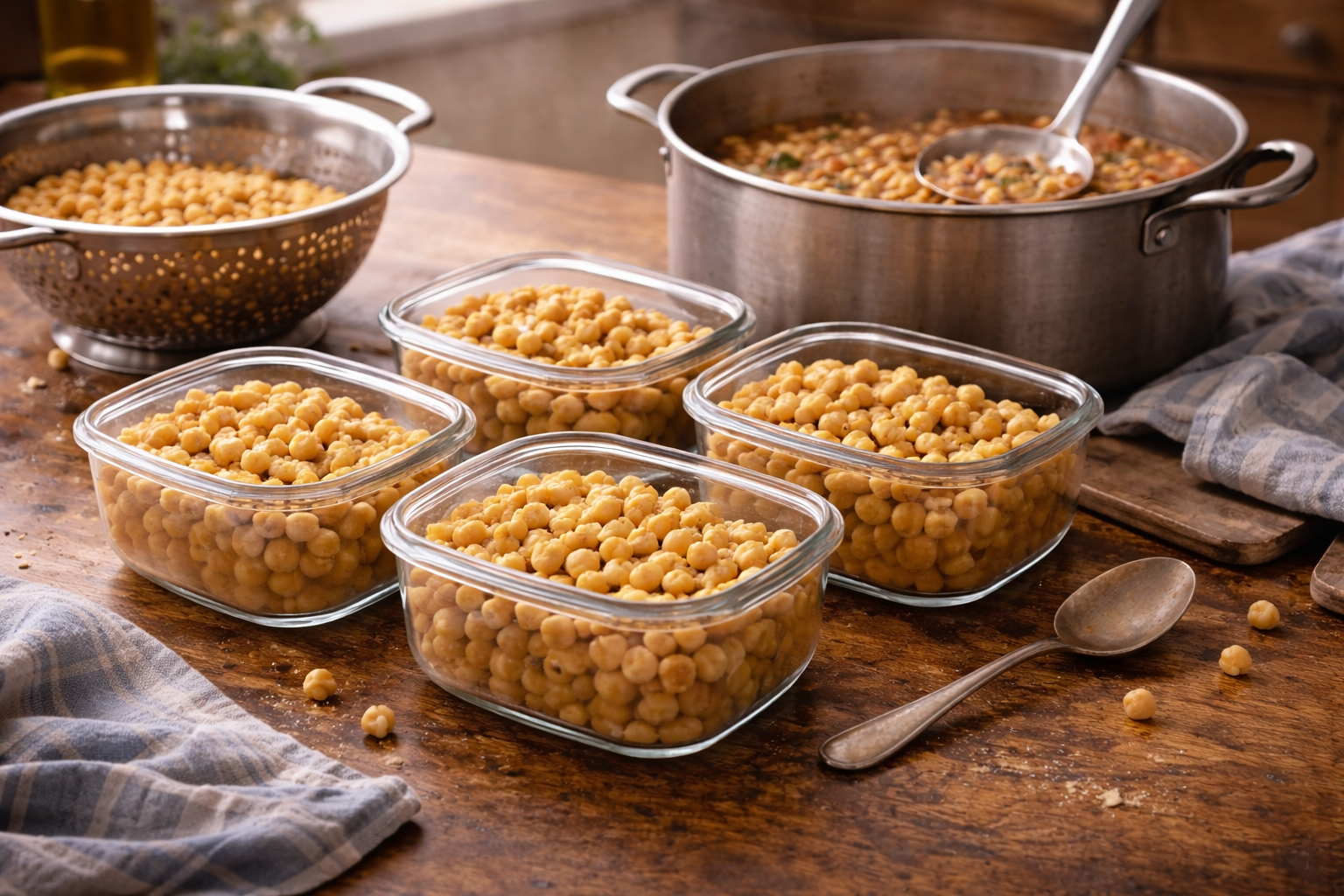 Portionne tes pois chiches cuits en contenants de 1 3/4 tasse (435 ml) ou environ 285 g, soit l’équivalent pratique d’une conserve de 540 ml égouttée. Ajoute une petite cuillère d’eau de cuisson dans chaque portion avant de congeler. La texture reste plus belle, surtout pour les soupes, les currys et le hummus. Tu cuisines une fois, puis tu t’achètes plusieurs soirs de tranquillité, ce qui coupe directement dans les commandes improvisées, les achats paniques et le grand classique du “je sais plus quoi faire, on va acheter de quoi”.