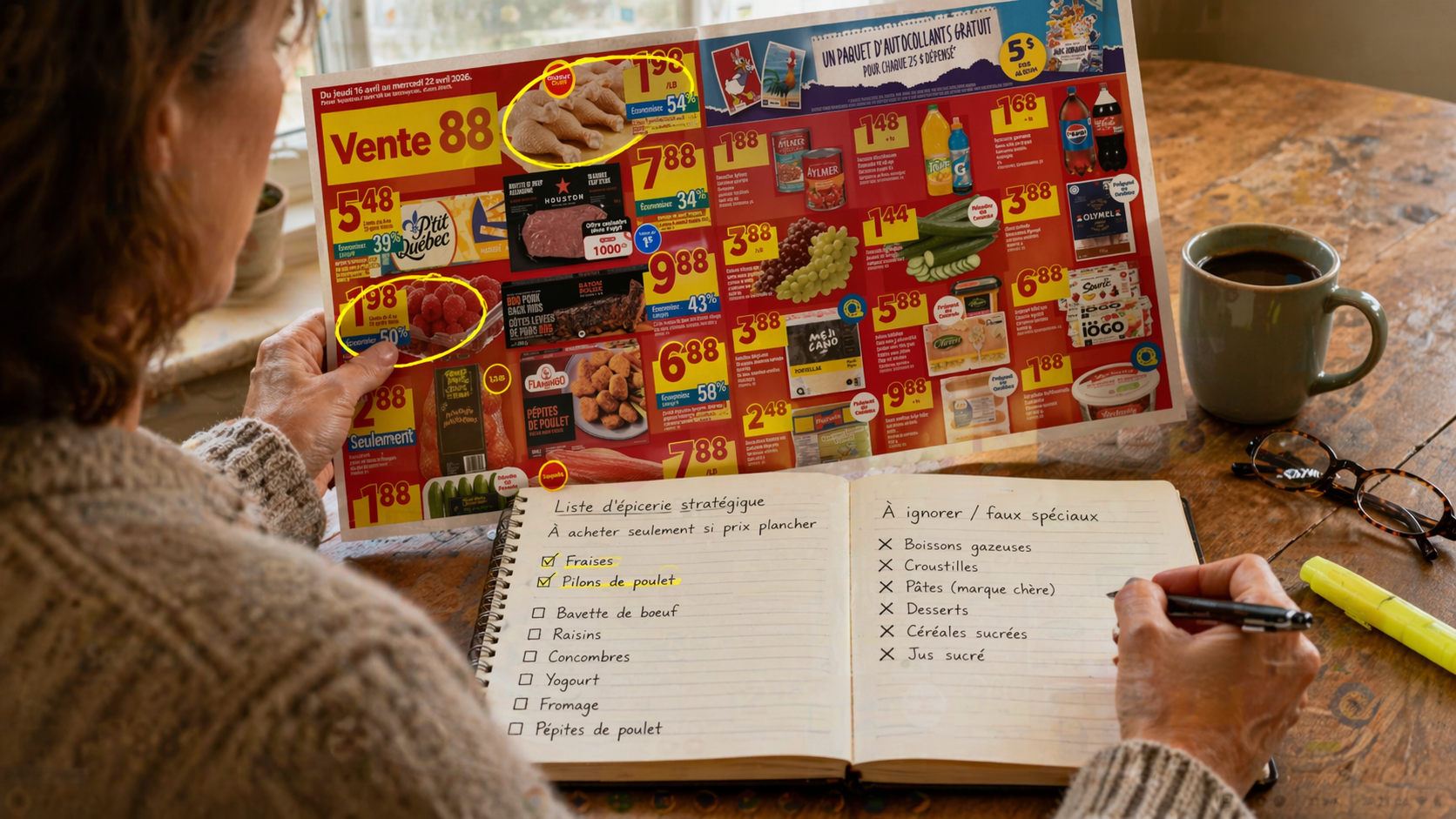 Ne regarde jamais une circulaire comme une liste de choses à acheter. Regarde-la comme un tableau de signaux à vérifier. Les produits en première page sont souvent des spéciaux d’appel conçus pour t’attirer, pas pour rendre tout le magasin avantageux. Commence par tes produits connus. Vérifie ensuite le prix au kilo, le format exact et la fréquence du rabais. Une circulaire utile, ce n’est pas celle qui t’excite. C’est celle que ton carnet confirme, pendant que ton cerveau, lui, reste parfaitement calme.
