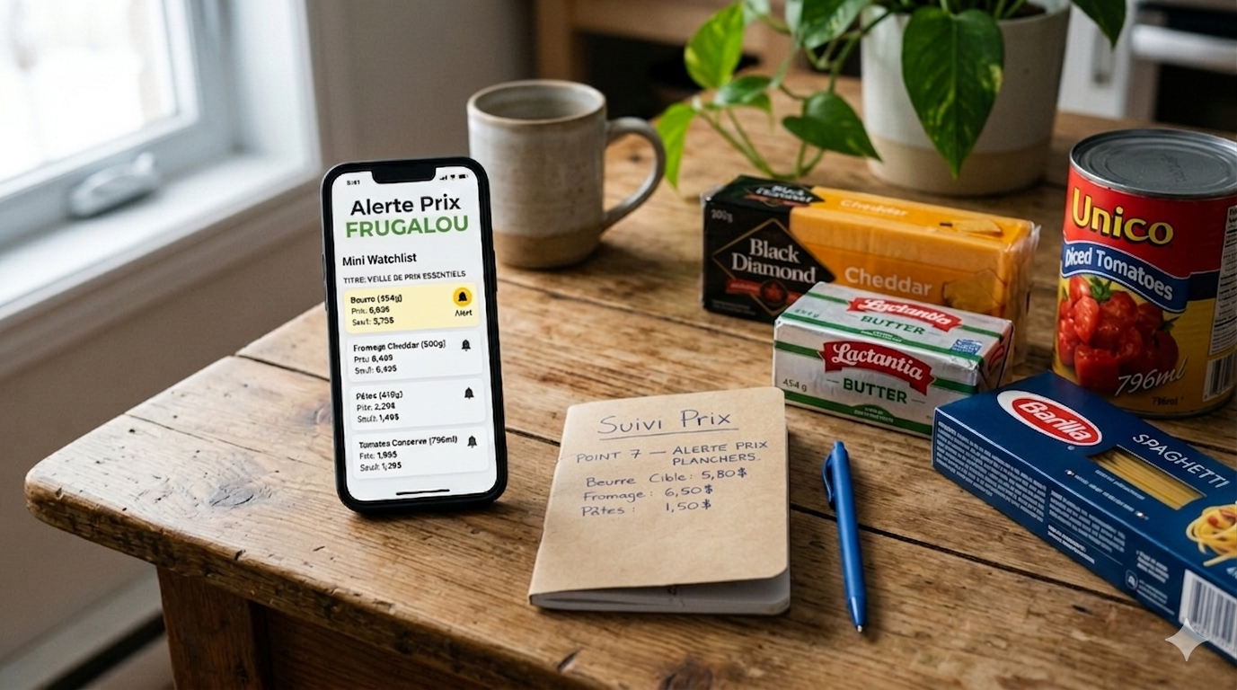 C’est ça, au fond, un système d’alerte de prix planchers. Ce n’est pas quelque chose de compliqué, ni une manie de technophile qui veut transformer son téléphone en salle de marché pour fromage en blocs, beurre salé et tomates en conserve. C’est juste une façon organisée de surveiller les quelques produits qui comptent vraiment dans ton budget. Tu identifies ce que tu achètes souvent, tu détermines le prix cible qui vaut réellement la peine, puis tu te prépares à agir quand ce moment arrive. Pas à improviser. Pas à débattre intérieurement pendant neuf minutes devant l’étalage. À agir proprement.