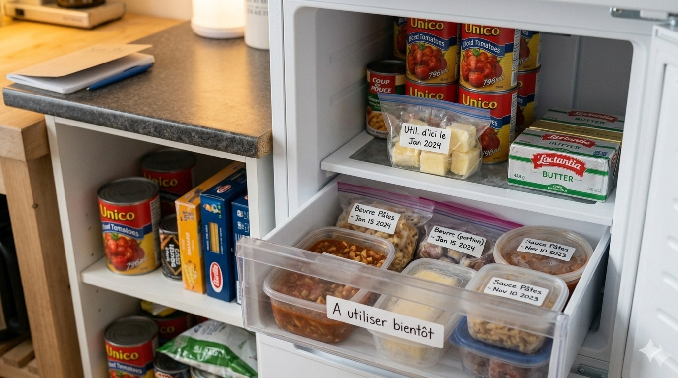 Premier entré, premier sorti. C’est plate, oui. C’est aussi extrêmement payant. Mets les produits plus vieux en avant, les nouveaux derrière, date ce que tu congèles et garde une petite zone “à utiliser bientôt”. Léa a raison là-dessus : une réserve qui ne circule pas devient vite une fausse bonne idée qui encombre plus qu’elle aide. Le stockpile le plus rentable n’est pas le plus gros. C’est celui que tu vois, que tu comprends et que tu cuisines sans devoir partir en expédition archéologique.