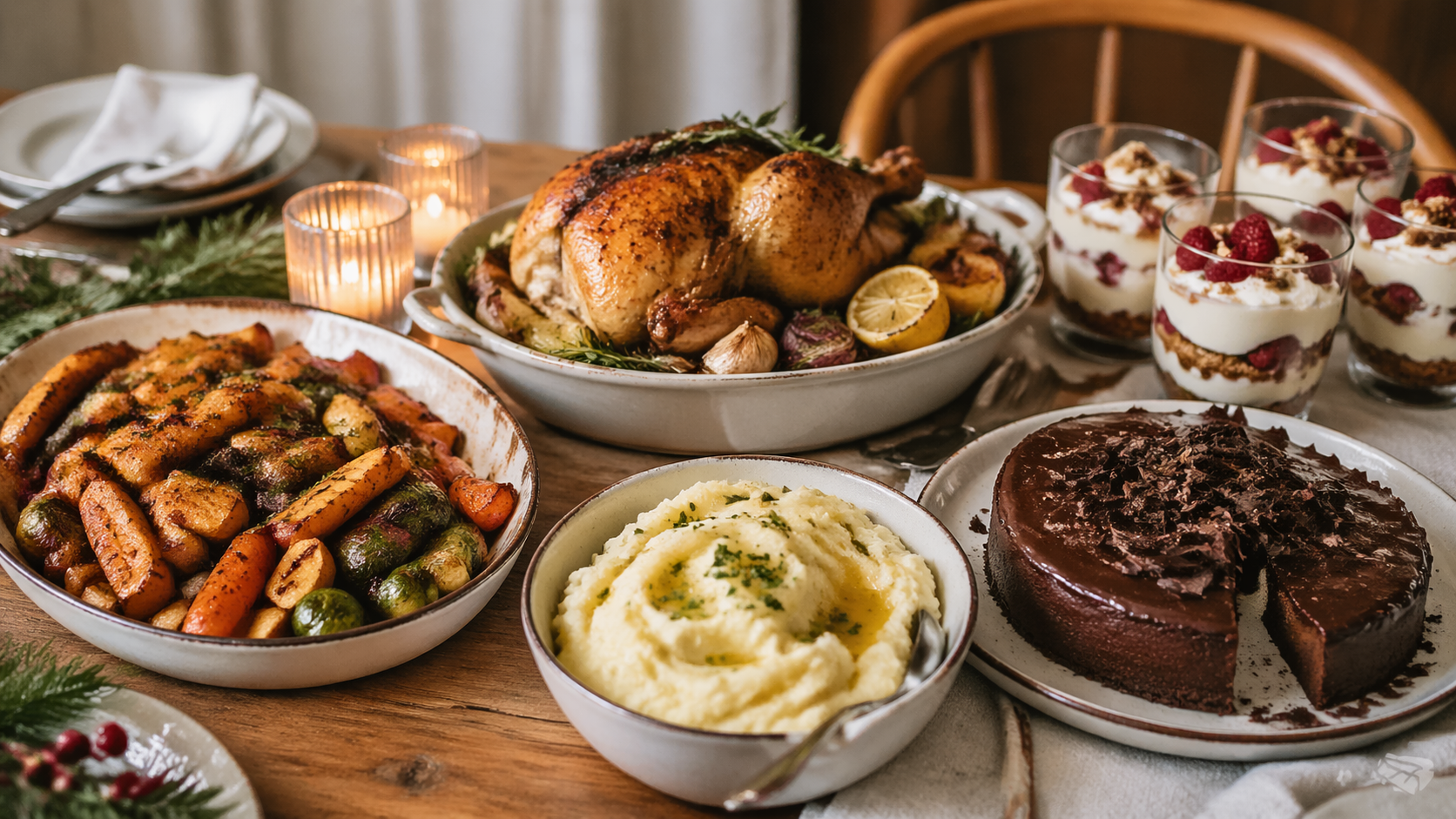 Je le dis souvent parce que c’est vrai : les repas qui paraissent les plus “chers” sont rarement les plus remplis. Ce sont souvent les plus cohérents. Une belle volaille dorée. Une purée ou un féculent réconfortant. Un plat de légumes rôtis colorés. Un dessert riche. Un dessert léger. C’est déjà énormément. C’est complet. C’est harmonieux. C’est beau. Et ça laisse encore un peu d’air à la personne qui reçoit, ce qui est quand même un détail non négligeable si on souhaite qu’elle reste sympathique jusqu’au café.