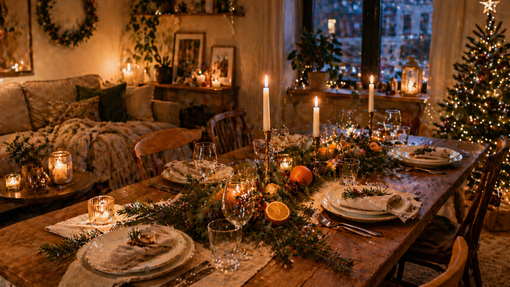 Pour moi, une belle ambiance de réveillon, c’est trois choses : lumière chaude, table épurée, puis un ou deux rappels naturels qui font écho aux plats. Si le repas a des herbes, des agrumes, des tons verts, dorés, crème ou rouges profonds, la table devrait suivre cette ligne-là. Pas besoin de quatorze couleurs, de centres de table géants ou d’objets qui empêchent le monde de se voir. L’élégance, encore une fois, vient rarement de l’accumulation. Elle vient du calme. Puis Noël, au fond, devrait ressembler à ça : du monde qui se regarde, qui mange bien, qui rit un peu, puis qui n’a pas l’impression d’être assis dans une vitrine.
