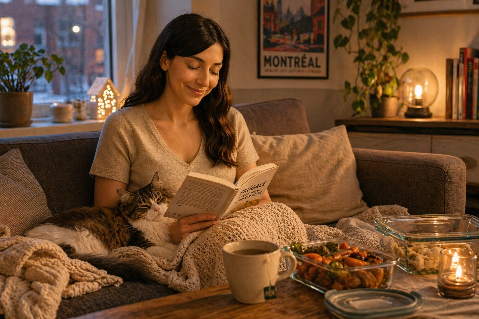 Je vais te dire où je me vois, moi, après tout ça. Je me vois revenue chez nous, sur le Plateau, la soirée un peu retombée, mon chat installé pas loin de moi comme s’il avait personnellement supervisé toute l’opération émotionnelle de décembre. Il est là, tranquille, avec cette face très assurée des chats qui ont l’air de penser que tout logement leur appartient légalement. Moi, je suis assise avec une couverture, un thé, quelques restants bien rangés, puis ce mélange très particulier de fatigue et de satisfaction qu’on ressent quand quelque chose s’est bien passé sans avoir eu besoin de virer ça en performance olympique.