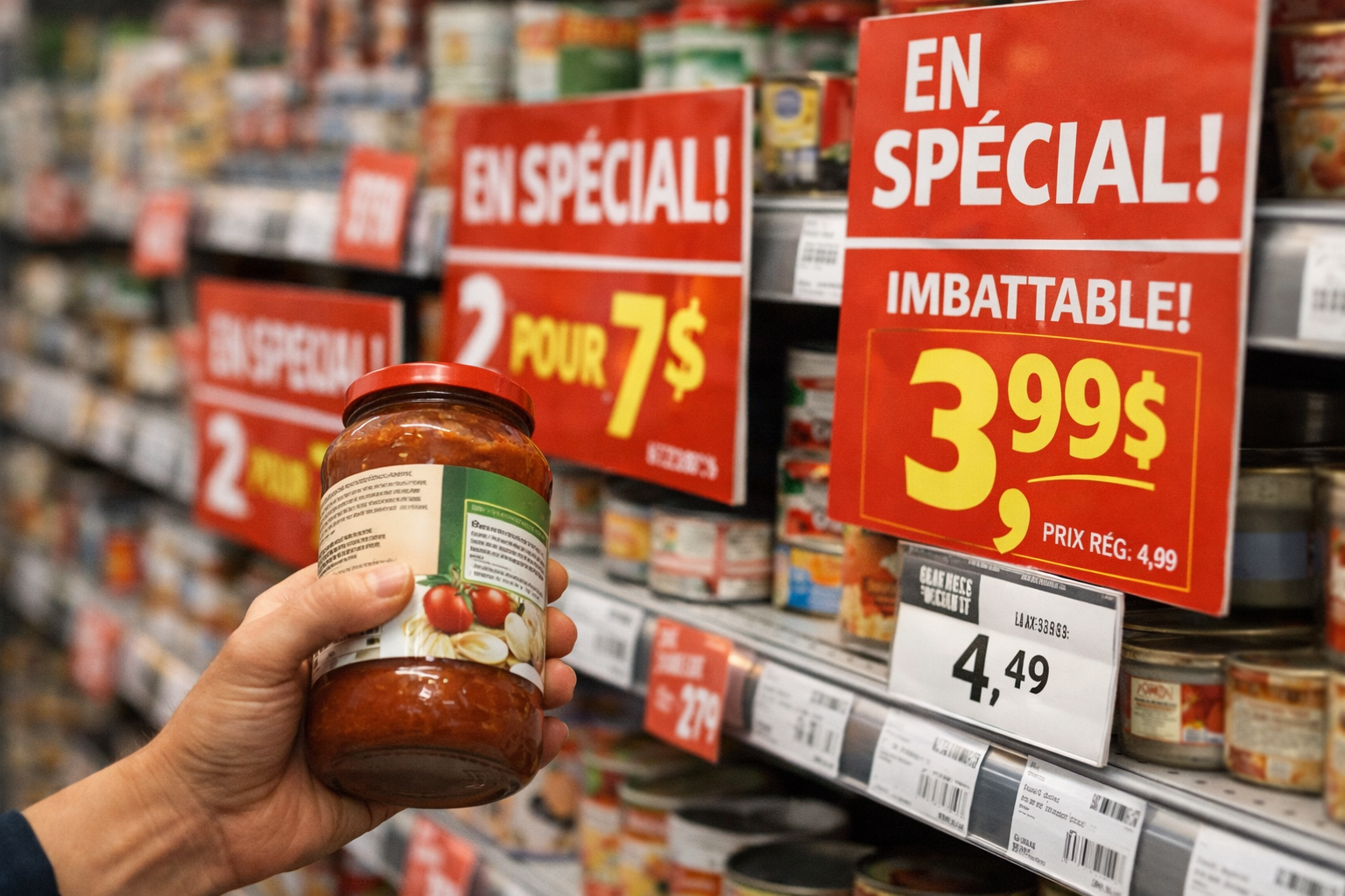 Un produit en spécial n’est pas automatiquement un produit pas cher. Souvent, c’est juste un produit un peu moins cher que son prix régulier gonflé. Et ça, ce n’est pas la même affaire du tout. Une sauce à spaghetti passée de 4,99 $ à 3,99 $, ça peut avoir l’air intéressant sur papier. Mais si elle tombe régulièrement à 2,49 $, ton “rabais” actuel est juste une façon plus polie de te faire payer trop cher.