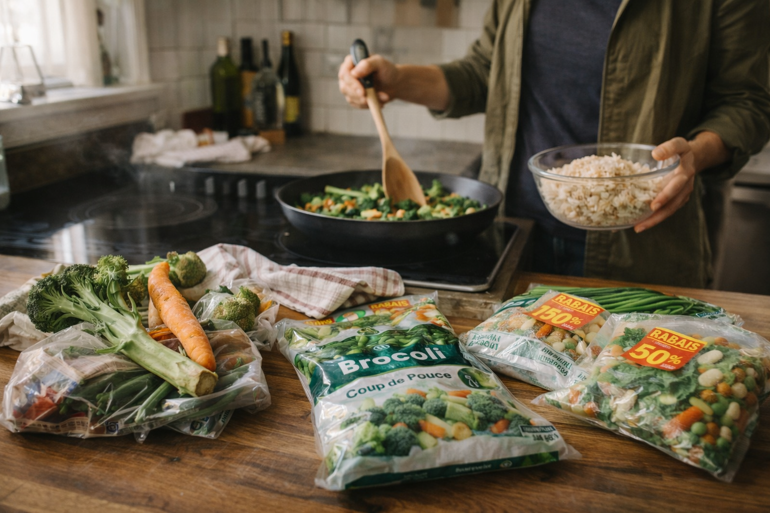 Garde toujours trois légumes surgelés de base à la maison: mélange de légumes, brocoli, épinards ou haricots. Utilise-les pour rallonger sauces, sautés, soupes, pâtes, omelettes et accompagnements. Tu stabilises tes repas, tu réduis les sorties d’urgence à l’épicerie et tu diminues énormément le gaspillage du bac à légumes. Le frais devient alors un bonus stratégique, pas une obligation coûteuse imposée par une image de perfection complètement irréaliste.