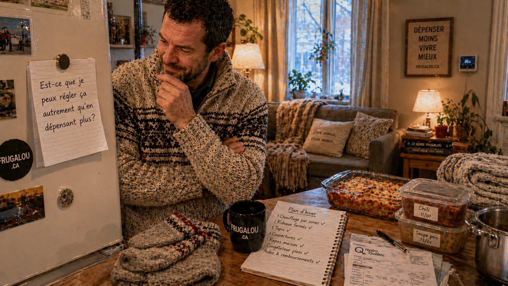 Et franchement, ton hiver aussi.Alors avant que le froid s’installe pour vrai, fais ton tour. Regarde tes fenêtres. Touche tes cadres. Vérifie tes rideaux. Regarde ton thermostat. Ouvre ton congélateur. Sors tes couvertures. Mets un tapis là où tes pieds sacrent intérieurement. Note tes vrais problèmes. Pas quinze. Trois. Commence là. La frugalité efficace, ce n’est pas de tout régler en même temps comme si tu préparais une mission spatiale. C’est de corriger les pertes qui reviennent, celles qui grugent ton budget semaine après semaine.