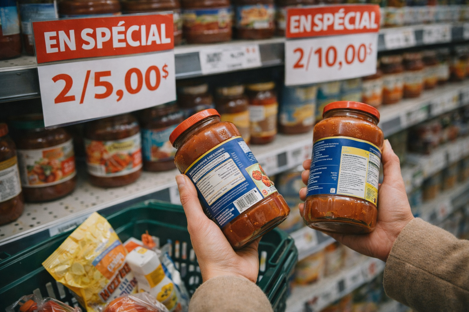 Choisis 15 produits fréquents chez toi — beurre, lait, pain, pâtes, fromage, yogourt, poulet, etc. — et note leur vrai bon prix quand tu le vois. Après quelques semaines, tu vas reconnaître presque instantanément ce qui mérite d’être stocké, ce qui est seulement “pas pire”, puis ce qui est carrément un faux deal maquillé. C’est là que tu cesses d’être impressionné par la pancarte.