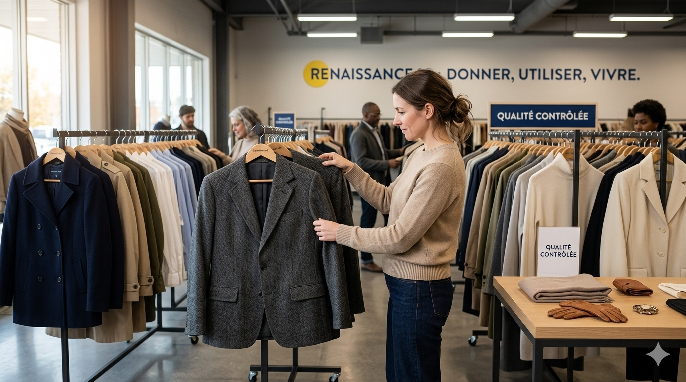 Ce qui rend Renaissance encore plus intéressante, c’est que ton achat ne sert pas uniquement à économiser. Il participe aussi à une logique de réemploi et d’insertion en emploi. Autrement dit, tu ne fais pas juste éviter une dépense inutile dans le neuf. Tu encourages aussi un modèle qui aide concrètement des gens à retrouver des repères, des habitudes stables et une place plus solide dans la vie active. Et ça change complètement la saveur de l’achat. Tout à coup, ton blazer, ton cardigan ou ton manteau n’est plus juste une trouvaille. C’est une dépense plus cohérente, plus utile, plus humaine.
