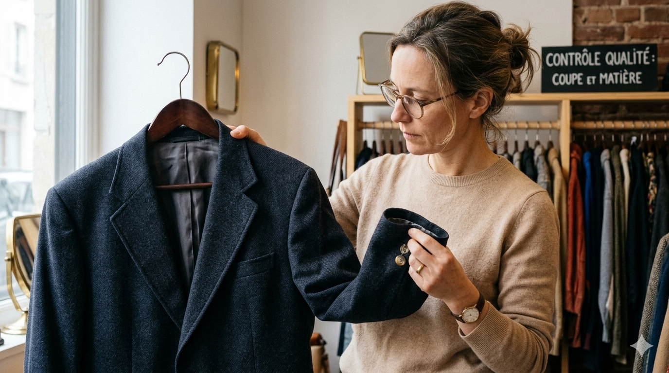 Le vrai frugal chic demande donc un œil plus lucide, un peu plus sévère, puis franchement plus utile. Quand tu magasines en seconde main, tu ne regardes pas juste si la pièce est belle de loin. Tu regardes si elle tient encore debout pour vrai. Les épaules. La ligne de taille. Les poignets. Les aisselles. Les boutons. Les fermetures éclair. L’ourlet. La doublure. La densité du tissu. La transparence. Le tombé. La tenue générale. Est-ce que la matière a encore de la vie? Est-ce que le vêtement garde une certaine prestance? Est-ce qu’il a l’air propre, net, crédible? Parce que si la coupe est mauvaise, le prix ne la sauvera pas. Si le tissu est fatigué, le côté chic va mourir avant même d’avoir commencé. Et si la pièce demande trop d’entretien, trop de retouches ou trop de patience pour ta vraie vie, elle va finir oubliée comme les autres.