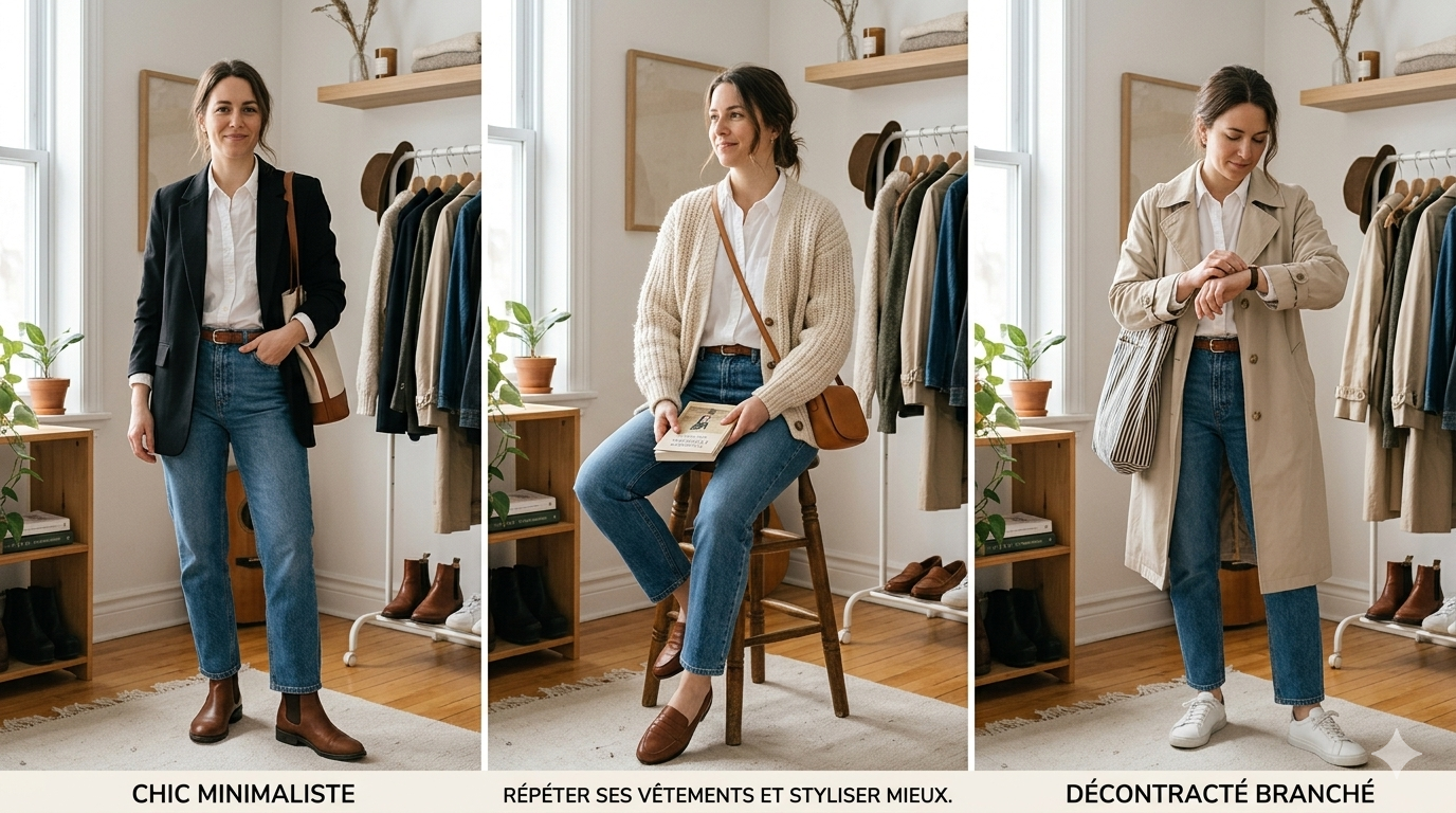 C’est exactement là que le styling devient plus important que le shopping. Une même base peut avoir plusieurs vies si tu changes le manteau, la chaussure, la ceinture, le sac, la texture ou le bijou. Un jean droit avec un tricot et des bottines ne raconte pas la même histoire que ce même jean avec une chemise blanche, un blazer sobre et une ceinture nette. Le vêtement est le même, mais l’effet change complètement. Voilà la vraie intelligence vestimentaire : pas accumuler plus, utiliser mieux.