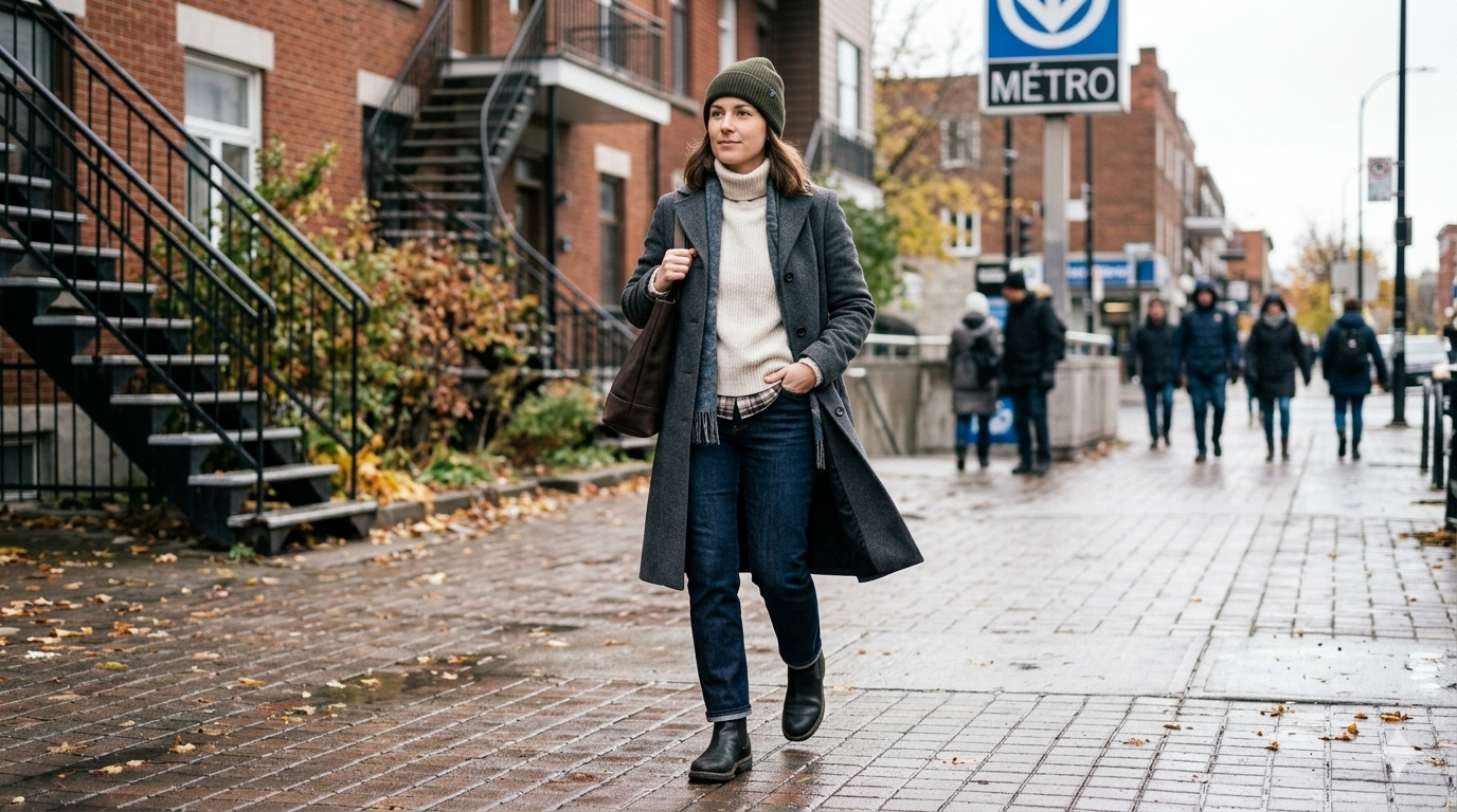 C’est justement pour ça que le frugal chic québécois doit viser autre chose que le parfait visuel. Il doit viser le portable crédible. Le manteau qui te donne de la prestance quand tu sors dehors. La botte propre qui tient la route. Le sac pratique, mais net. Le tricot qui garde une belle tenue. Le pantalon qui fonctionne avec plus qu’un seul look. La palette qui se mélange sans te forcer à acheter encore pour compléter. Ici, l’élégance n’est pas dans le décor. Elle est dans la résistance. Dans la capacité d’une pièce à vivre avec toi au lieu d’exiger une vie imaginaire.