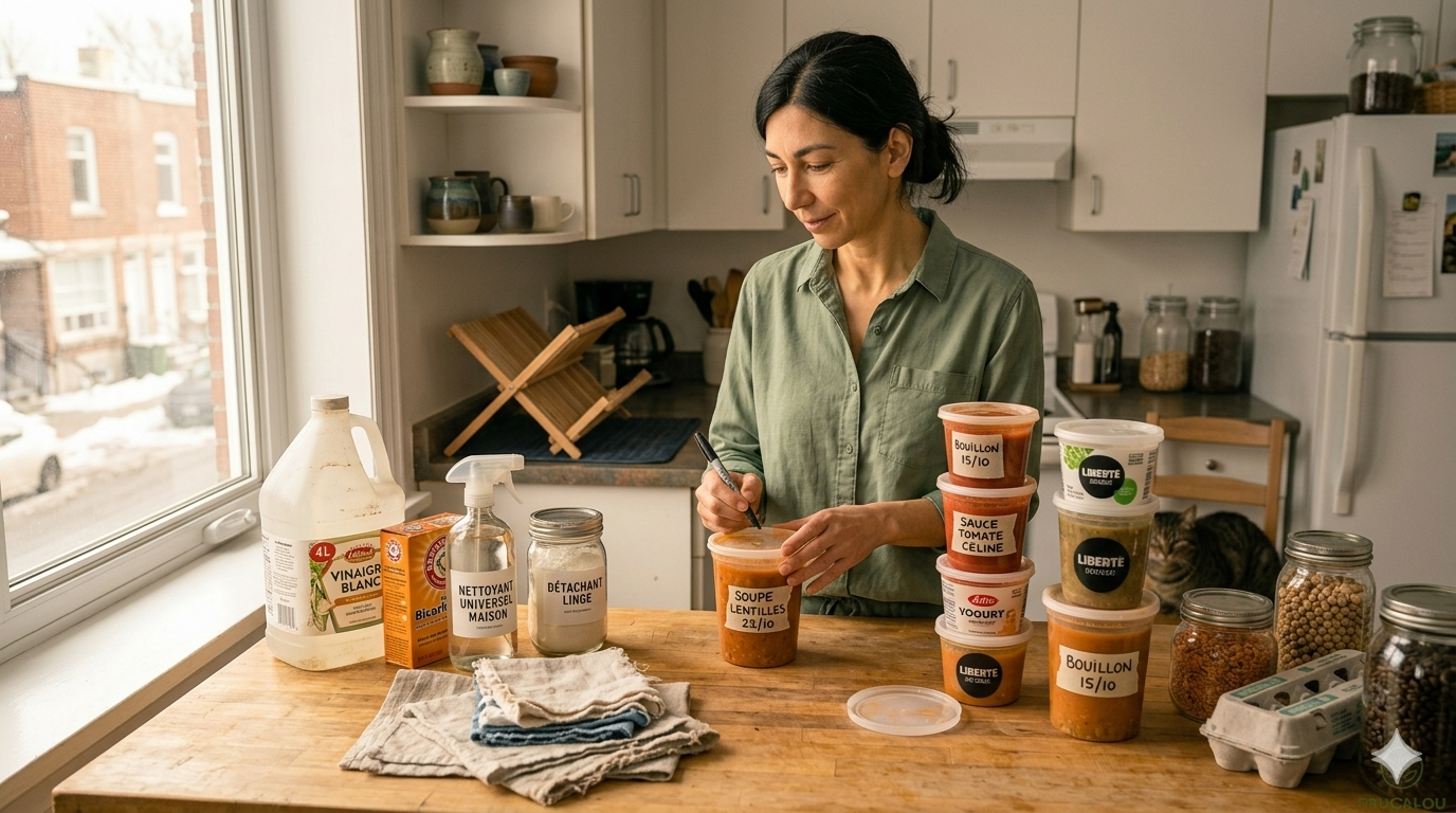 Moi, j’ai toujours aimé les gestes qui sauvent à la fois du cash, du temps puis du gaspillage. Ceux-là me procurent une satisfaction très particulière. Peut-être parce qu’ils ne demandent pas de se punir. Ils demandent juste un peu plus d’attention. Par exemple, j’utilise souvent des pots de yogourt vides pour la congélation. Pas pour me donner un genre. Juste parce que c’est pratique, gratuit, puis parfait pour des petites portions de soupe, de sauce ou de bouillon. C’est le genre de détail simple qui finit par faire une vraie différence.