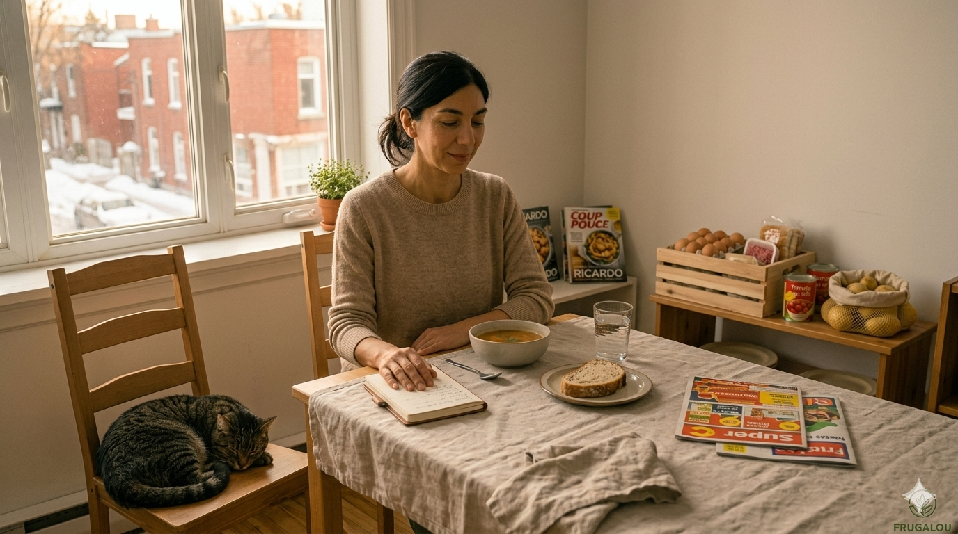 Choisis 5 repas refuge économiques que tu peux cuisiner presque sans réfléchir : soupe-repas, pâtes, riz sauté, omelette, légumineuses en sauce. Garde toujours leurs bases à la maison et note-les sur une feuille visible. Ajoute un petit système simple : un plat à manger maintenant, un à congeler, un reste à transformer. Consulte aussi les recettes FRUGALOU pour varier sans compliquer. Cette structure réduit les commandes impulsives, le gaspillage, les “je sais pas quoi faire” et la fatigue mentale autour des soupers.