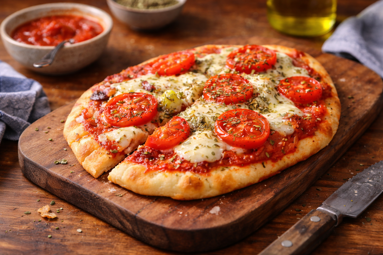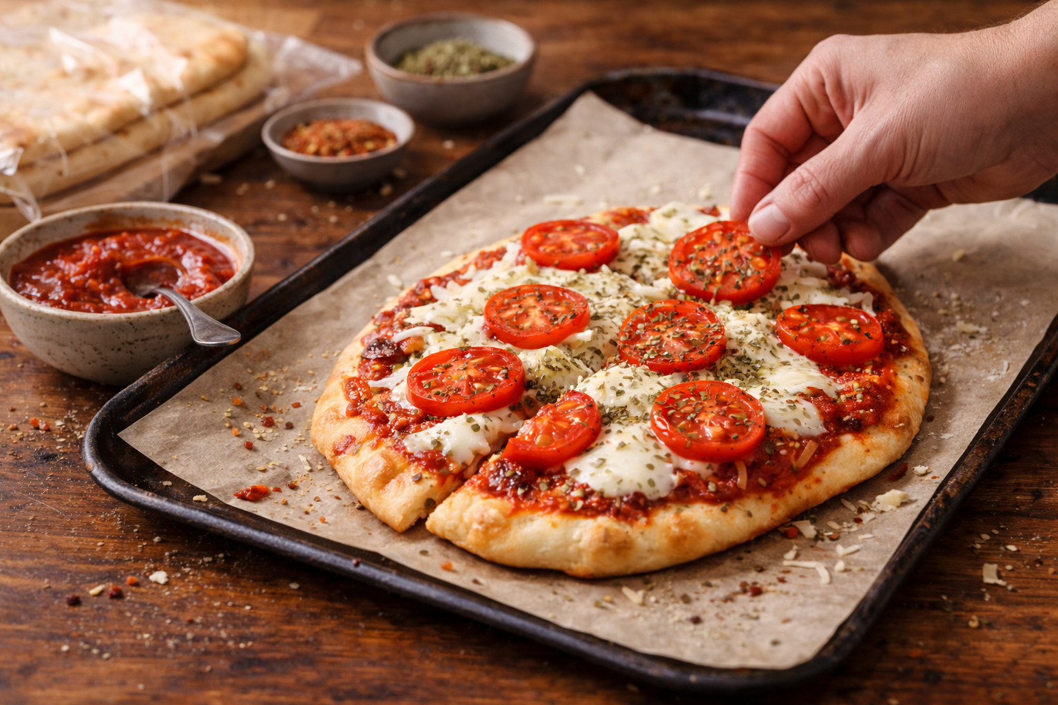 Cette première naanza est la preuve qu’une recette frugale peut être simple, rapide et profondément satisfaisante sans tomber dans le fade. Martin aime son côté direct, fiable, presque impossible à rater. Léa, elle, aime surtout sa capacité à transformer des ingrédients modestes en souper qui sent réellement la pizza maison. Ici, le secret n’est pas dans une longue liste d’ingrédients. Il est dans la façon de construire le goût. Une sauce tomate bien assaisonnée avec de l’ail en poudre, du basilic séché, de l’origan, du poivre noir et une touche de paprika devient tout de suite plus ronde, plus chaude, plus vivante. Le naan, lui, devient croustillant sur les bords tout en restant moelleux au centre. La mozzarella fond doucement, les tomates rôtissent juste assez pour concentrer leur sucre naturel, puis l’ensemble donne quelque chose qui goûte plus cher qu’il ne coûte réellement.
