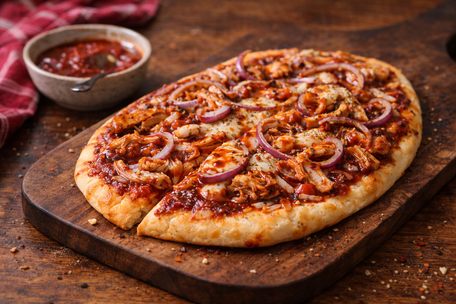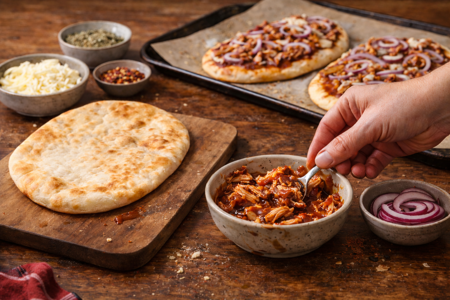 Cette recette-là incarne parfaitement l’intelligence frugale de Léa. Là où plusieurs voient un reste de poulet ordinaire, elle voit un souper complet, généreux, rassasiant, puis surtout plein de caractère. Martin aime cette naanza parce qu’elle goûte riche sans demander beaucoup d’effort. Le mélange sauce BBQ et sauce tomate donne une base à la fois fumée, légèrement sucrée, acidulée et réconfortante. Mais la vraie différence se joue encore dans les épices sèches. Une pincée de paprika fumé, un peu d’ail en poudre, un soupçon d’oignon en poudre, du poivre noir et une trace de chili broyé viennent transformer le tout. Le poulet, bien mélangé avec un peu de sauce avant d’être déposé sur la naanza, reste tendre pendant la cuisson. L’oignon, tranché très fin, apporte une petite douceur caramélisée qui équilibre le profil plus intense de la sauce.