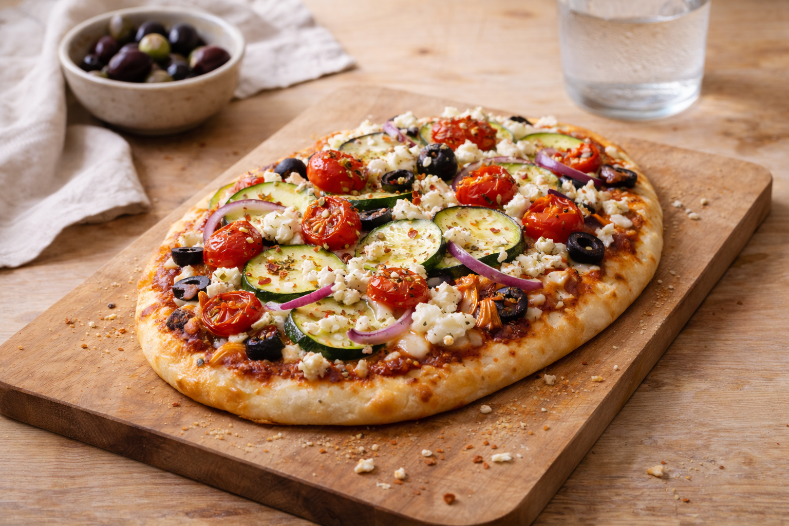 - Répartis la courgette, les tomates, l’oignon et les olives.