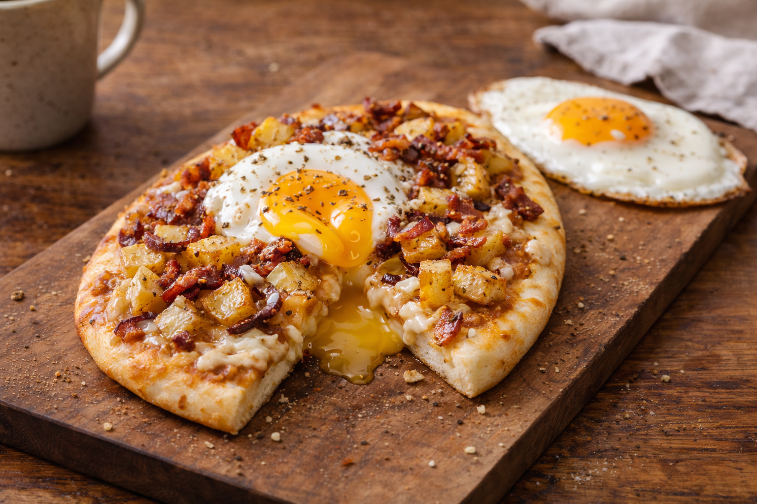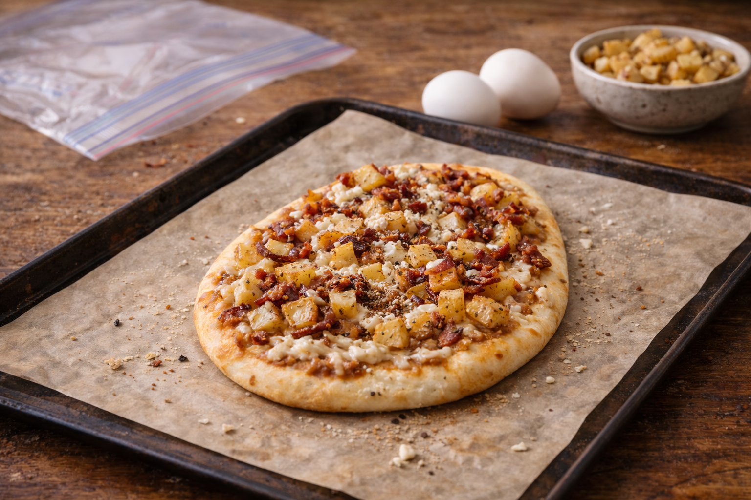 Pour cette version, pense comme un pizzaiolo et comme un meal-prepper: tout ce qui va sur la base doit déjà être cuit et sec. Les patates doivent être froides et bien asséchées; le bacon aussi. Pour congeler à plat, monte la base complète sans œuf, puis congèle-la sur plaque avant de l’emballer. Ne congèle pas l’œuf cru dessus. Pour cuire, va direct du congélo au four chaud, 11 à 14 minutes. Ajoute un œuf miroir après cuisson, ou casse un œuf dessus seulement à mi-cuisson si tu la fais fraîche.