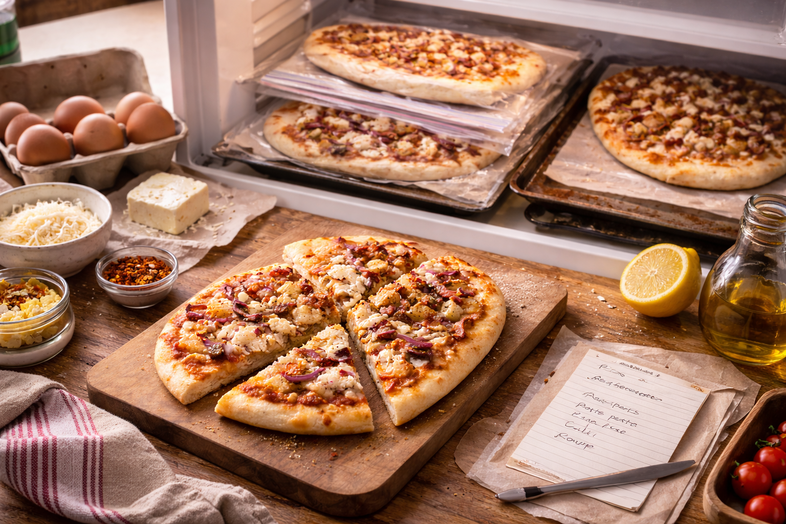 Comme dans les grandes pizzerias italiennes, la clé est la retenue: peu de sauce, fromage modéré, tomates très fines et bien épongées. Pour congeler à plat, monte la naanza sur une plaque recouverte de papier parchemin, puis mets-la 1 à 2 heures au congélo, jusqu’à ce qu’elle soit bien ferme. Ensuite, transfère-la dans un sac ou un contenant plat. Pour la cuisson, four à 425 à 450 °F, plaque déjà chaude, cuisson directe du congélo 10 à 13 minutes, sans décongélation.